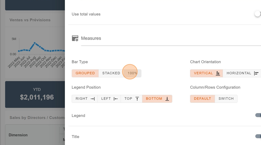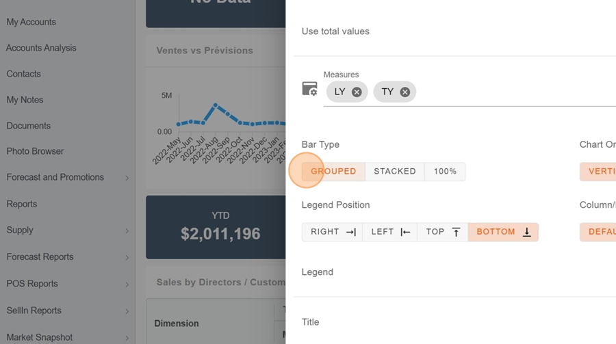 Pick your preferred options like bar type, dimension, legend position, and column/row setup. For bar type, we'll pick Grouped for this example.