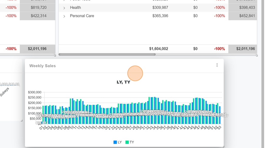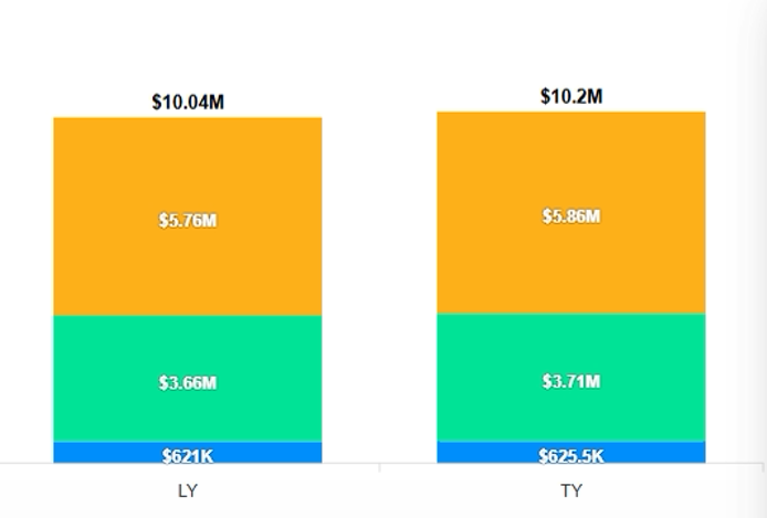 By repeating all the same steps as in the section above, but this time picking the Weekly Sales-By Customers view and theStacked option for bar type, we end up with a totally different chart