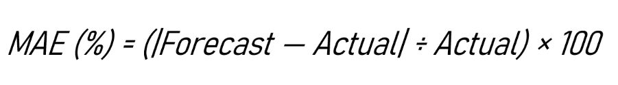 La MAE (%), aussi appelée WAPE, exprime l’erreur absolue en pourcentage de la demande.