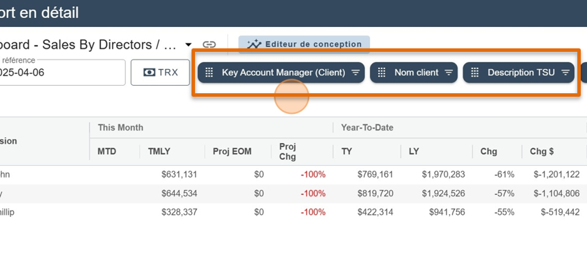 Il est important de comprendre que chacun des Widget affichés sont reliés aux dimensions affichés au haut de chacun des rapports.