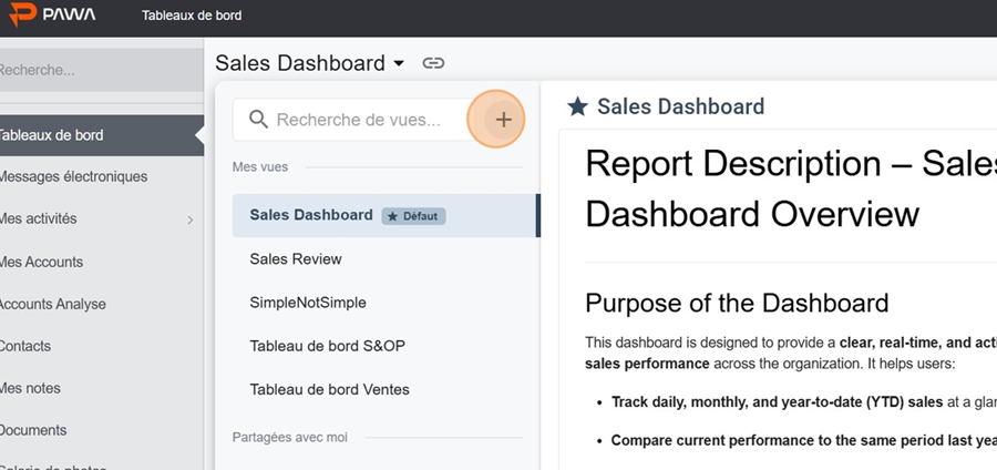 Il est possible d’ajouter une description de votre tableau de bord pour en définir l’objectif. Cette section s’affichera automatiquement lorsque vous le consulter par la suite